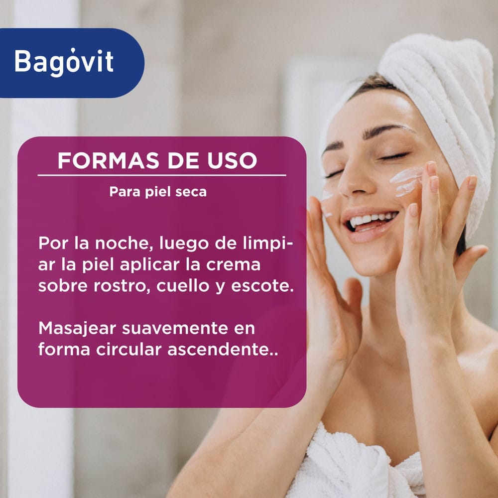 Por la noche, luego de limpiar la piel aplicar la crema sobre rostro, cuello y escote. Masajear suavemente en forma circular ascendente.