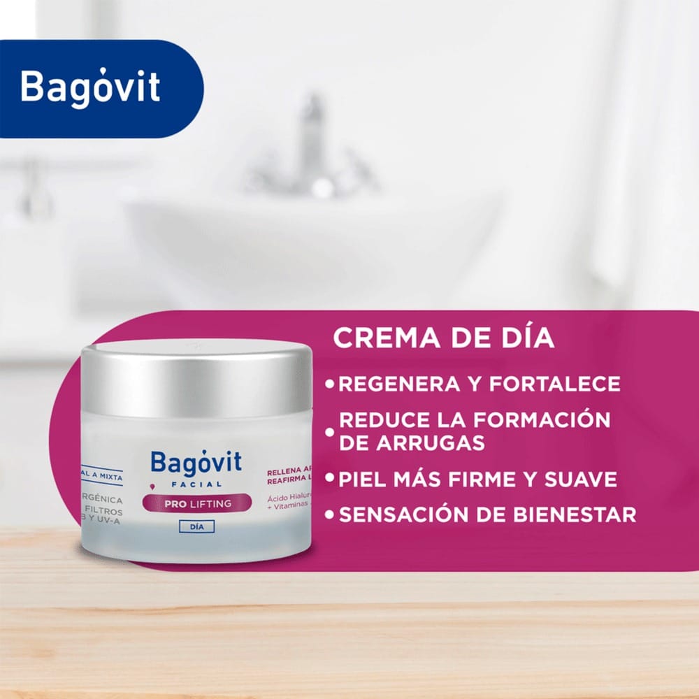 La Crema Facial Pro Lifting Día Todo Tipo de Piel Bagóvit es ideal para todo tipo de piel. En una agradable textura concentra Ácido Hialurónico, Vitaminas A y C y filtros UVB, UVA. Esta combinación otorga a la crema un poder reafirmante con una notable disminución en la profundidad de las arrugas. Posee una exclusiva fórmula de eficacia comprobada clínica y dermatológicamente.