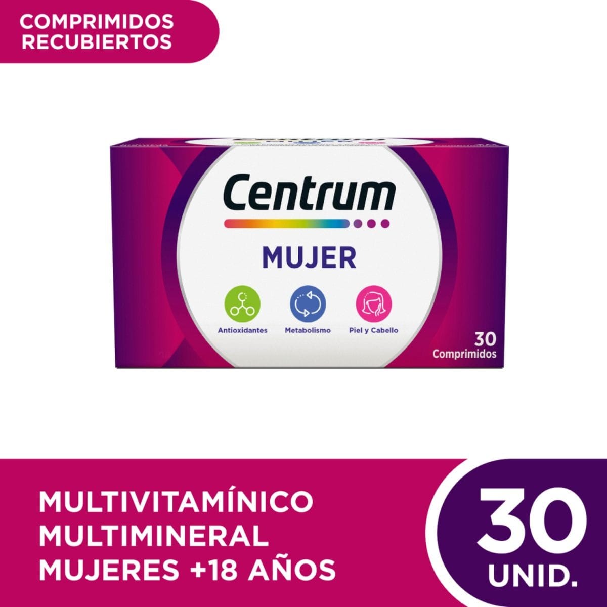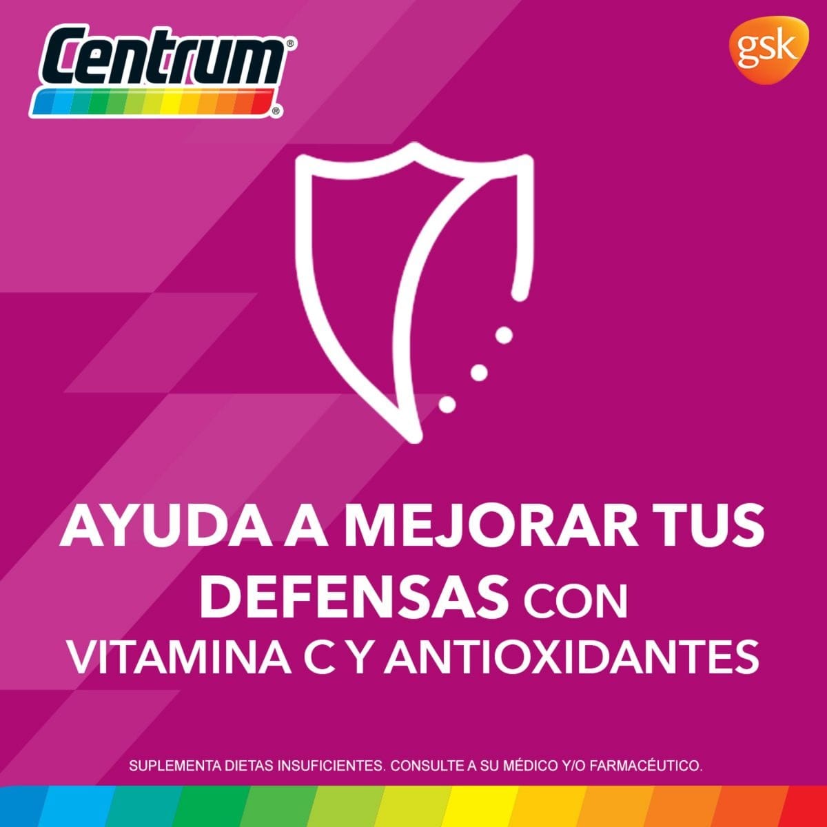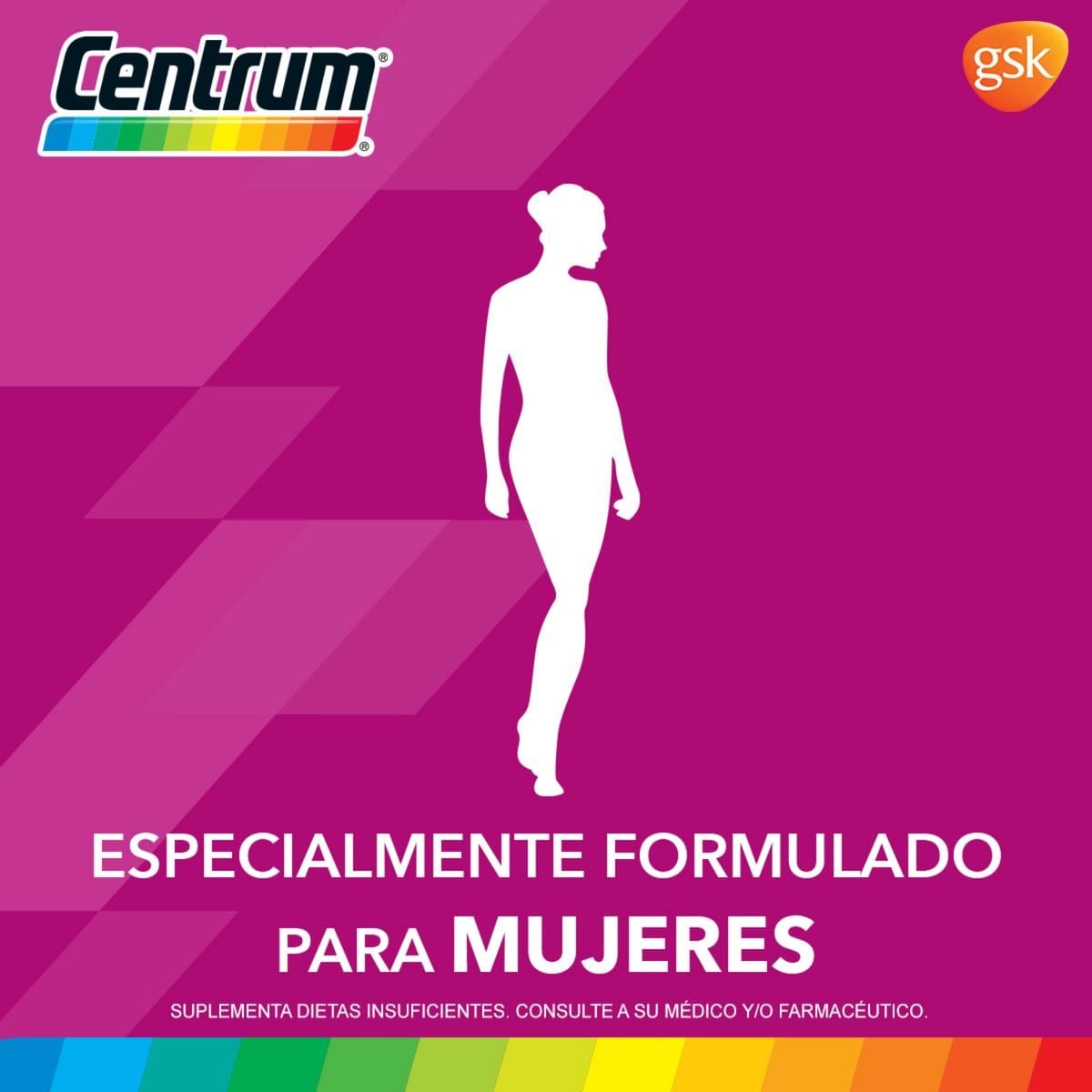 Un multivitamínico completo formulado desde la Vitamina A al Zinc. Su fórmula equilibrada está especialmente desarrollada para satisfacer las necesidades nutricionales específicas de las mujeres. Centrum Mujer es libre de grasas totales, calorías, azúcares y sodio. La fórmula de Centrum Mujer contiene micronutrientes que ayudan a: Energía, inmunidad, balance nutricional, salud de la piel, uñas y cabello, fortalecimiento de los huesos y metabolismo. Tomá Centrum Mujer todos los días y descubrí sus beneficios.