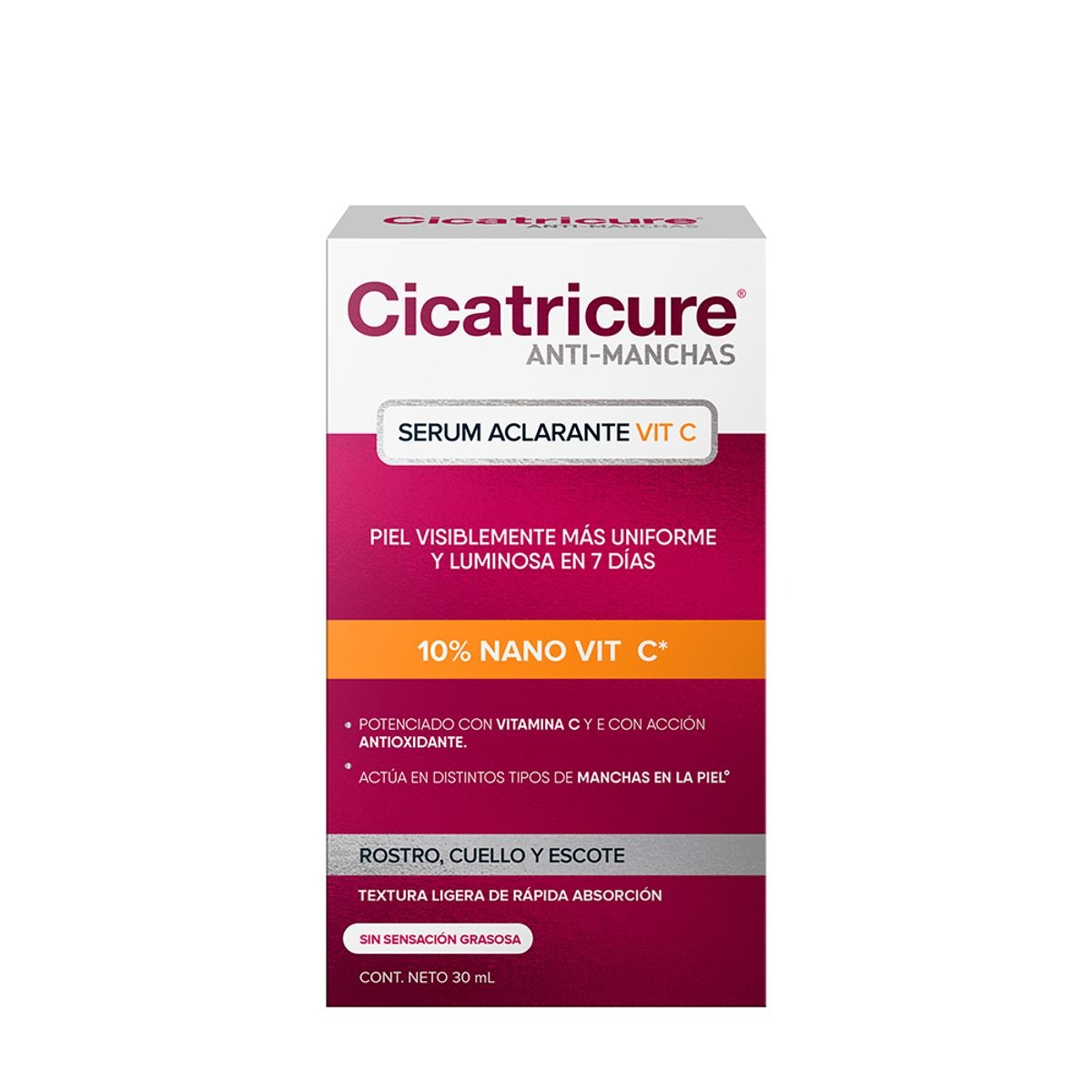Serum ACLARANTE y ANTIMANCHAS que promueve una PIEL visiblemente más UNIFORME y LUMINOSA en 7 días, esta potencializado con VITAMINAS C y E que brindan antioxidantes a tu piel además de actuar contra diferentes TIPOS DE MANCHAS (Manchas causadas por el sol y envejecimiento). Tiene una textura ligera y se absorbe fácilmente en la piel, no deja sensación grasosa. El serúm es ideal para aplicarlo en ROSTRO, CUELLO y ESCOTE.