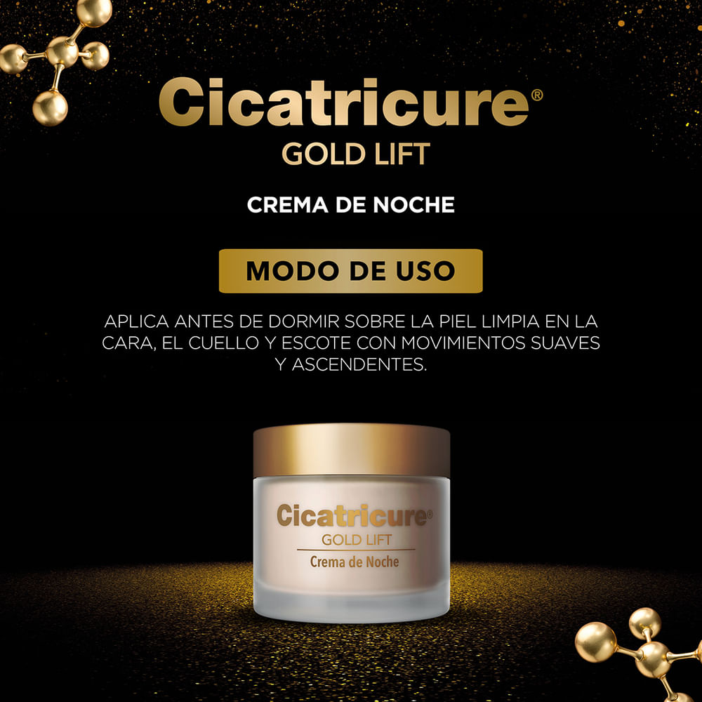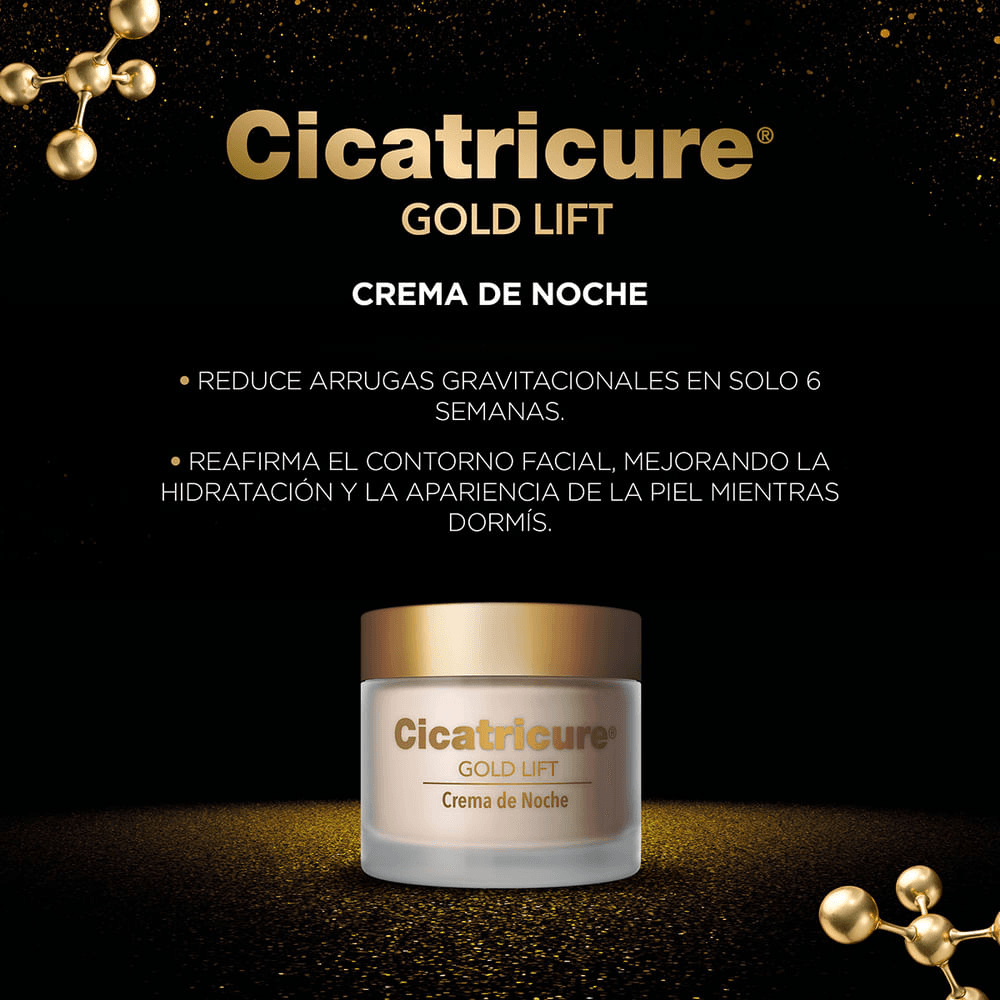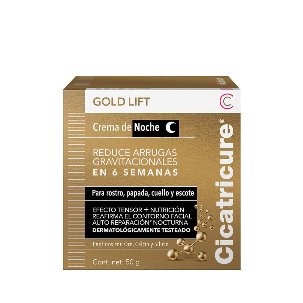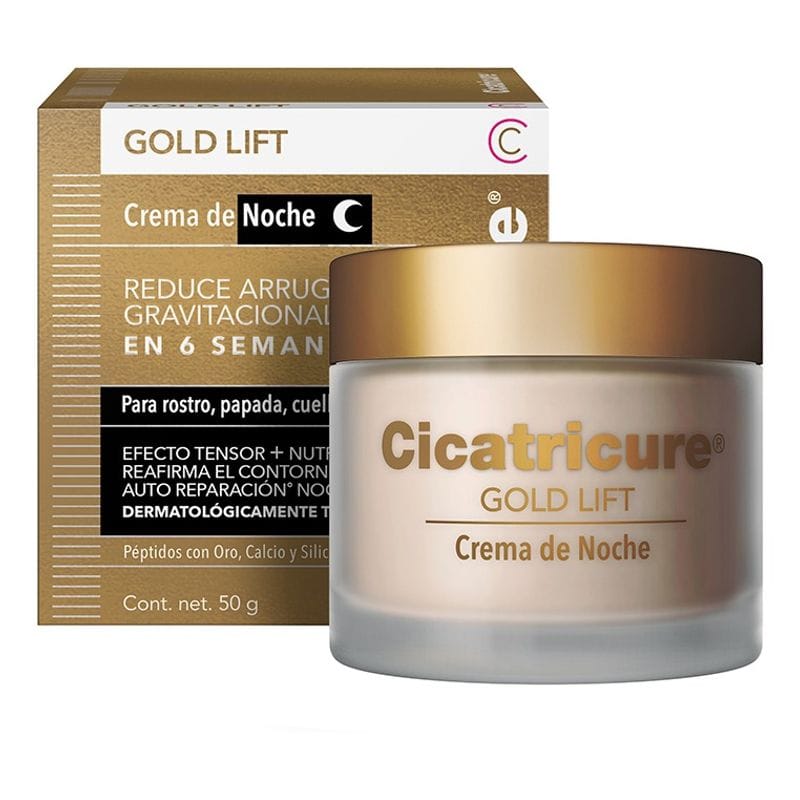 Cicatricure Gold Lift crema facial de noche combina el poder de los peptidos con oro, calcio y silicio reduciendo la profundidad de las arrugas gravitacionales y redefiniendo el contorno facial.
