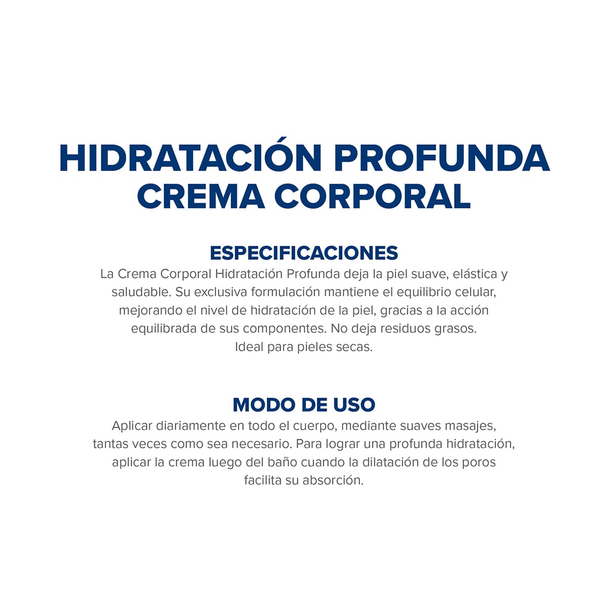 La Crema Corporal Hidratación Profunda brinda a las pieles con tendencia a secas la hidratación que necesitan para otorgarles una apariencia suave, elástica y saludable gracias a la acción equilibrada de sus componentes.