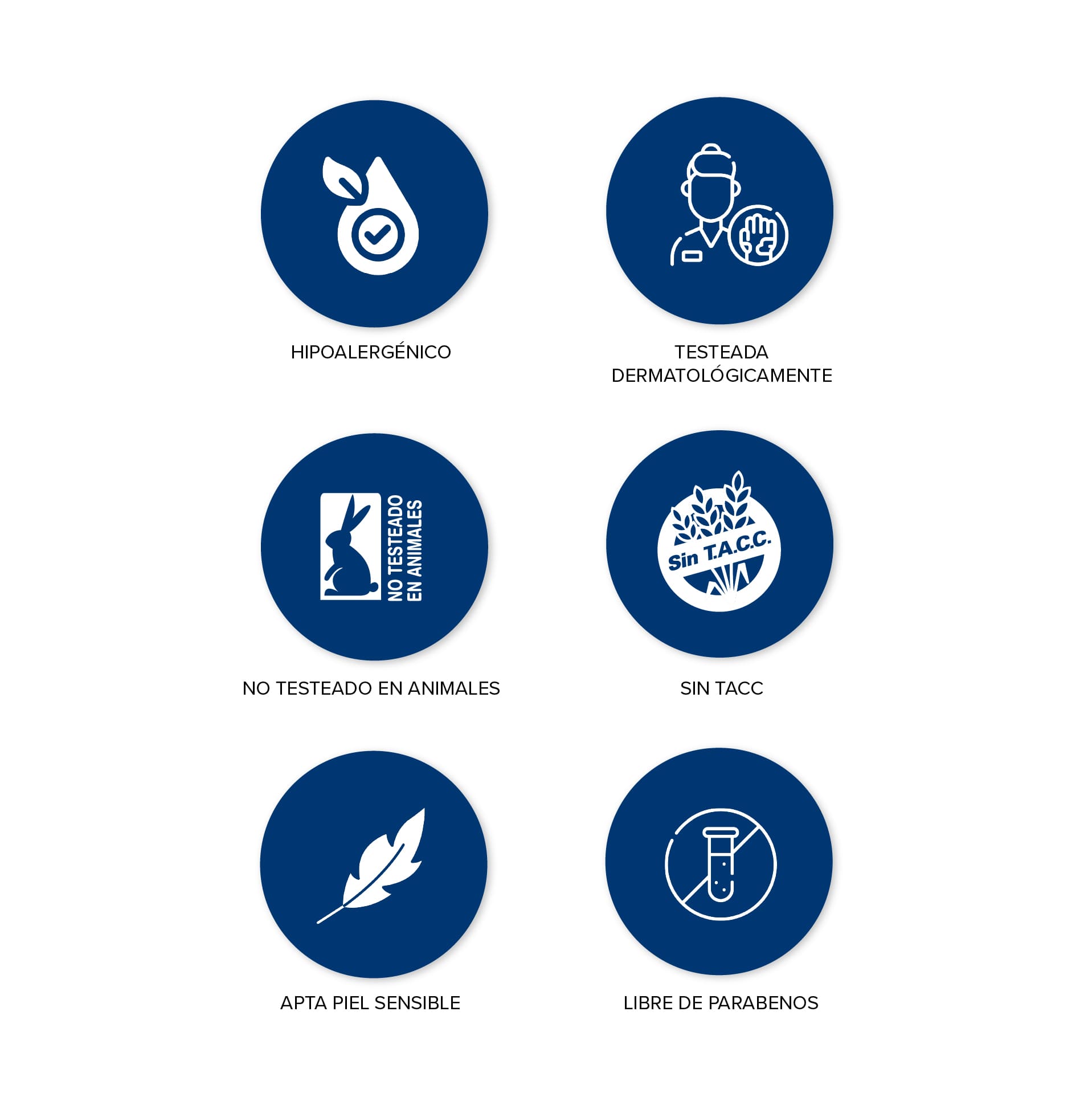 Hipoalergénica. Apta piel sensible. Testeada dermatológicamente. Sin parabenos. Sin TACC. No testeada en animales.