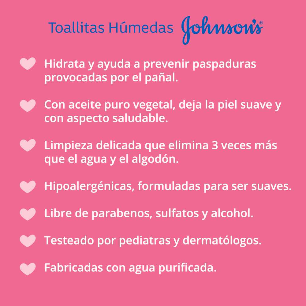 Las toallitas húmedas para bebé JOHNSON’S® baby Extra Cuidado están enriquecidas con crema hidratante y ayudan a prevenir irritaciones desde el primer uso, hidratando y preservando las barreras naturales de la piel del bebé. Gracias a su acción hidratante, protegen y cuidan la delicada piel de tu bebé. Limpian la delicada piel de tu bebé, sin irritarla ni resecarla. Está dermatológicamente comprobado y es hipoalergénico. Son suaves, más absorbentes y súper resistentes. Precauciones Manténgase alejado del alcance de los niños. Si observa alguna reaccion desfavorable, suspenda su uso, y en caso de que persista, consulte a su médico. Evítese el contacto con los ojos. Modo de uso Abrí la tapa adhesiva y retirá la primera toallita húmeda JOHNSON´S® Extra Cuidado. Pasá la toallita en las áreas de la piel de tu bebé que deseas limpiar y tirá la toallita a la basura una vez utilizada. Después de utilizarlas, cerrar la etiqueta autoadhesiva para conservar la humedad de las toallitas.