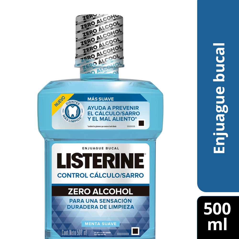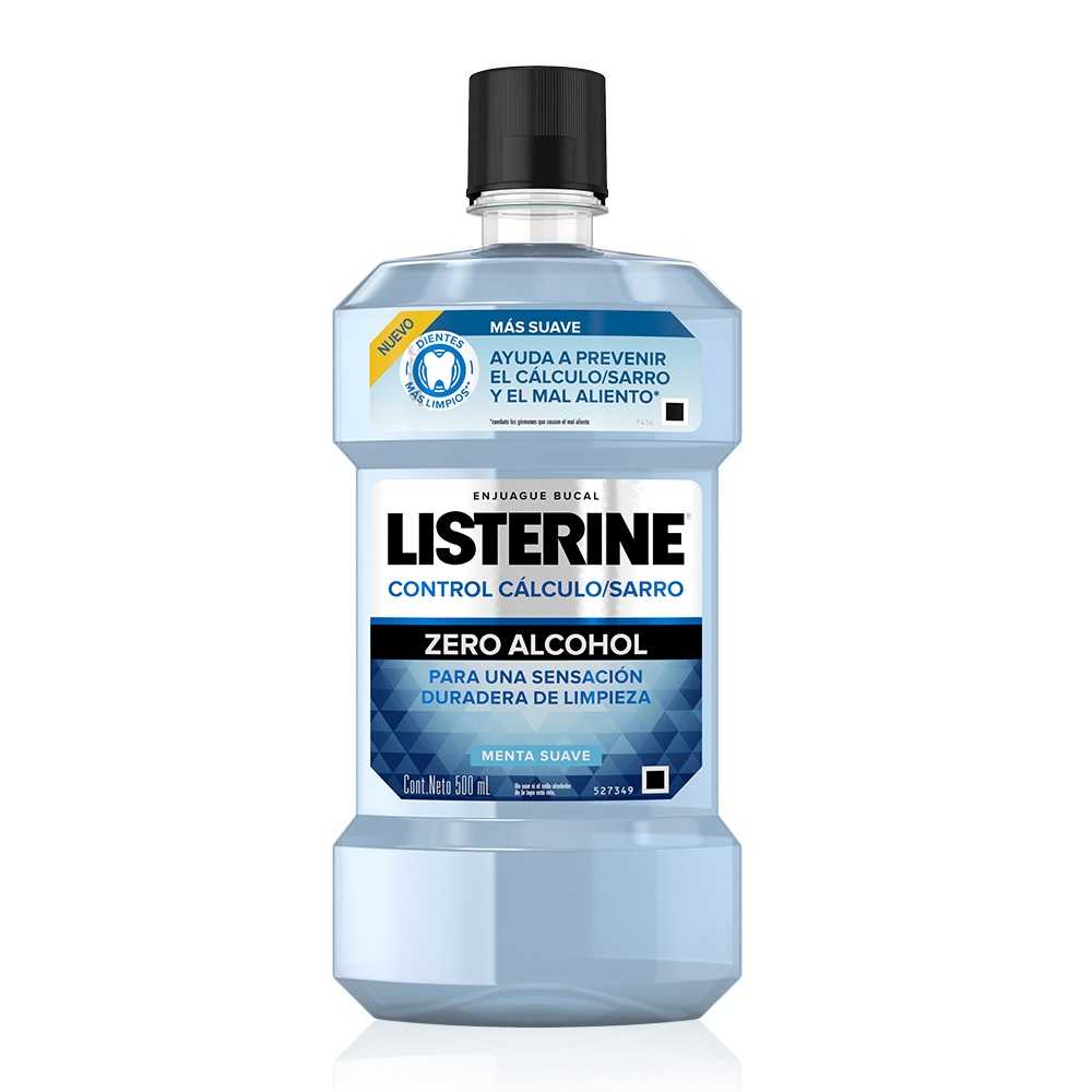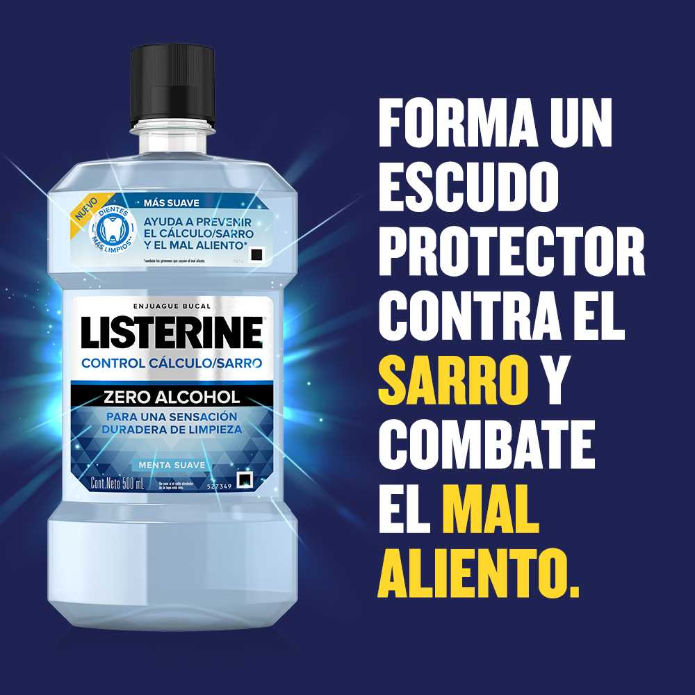 El enjuague bucal LISTERINE® Anti Sarro previene y controla la formación de sarro dental. Además, ayuda a combatir los gérmenes que causan el mal aliento y la placa bacteriana, protegiendo las encías. Beneficios Mayor eficacia en la reducción del sarro vs. la crema dental. Previene la formación de sarro dental gracias a la acción del Cloruro de Zinc. Reduce la placa bacteriana y los gérmenes que causan el mal aliento. Elimina hasta el 99% de los gérmenes. Ayuda a mantener las encías saludables. Ayuda a mantener el aliento fresco por 24 horas (se debe usar en la mañana y en la noche). Agradable sabor a menta fría.