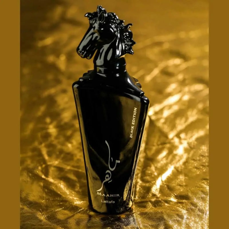 Maahir Black de Lattafa es una fragancia unisex con notas de azafrán y rosa en la apertura, seguido de akigalawood, cuero y ámbar seco en el corazón, y finaliza con acordes de oud, vainilla y almizcle en la base. Esta composición ofrece una experiencia olfativa sofisticada y cálida, ideal para quienes buscan destacar su individualidad con aromas clásicos y modernos