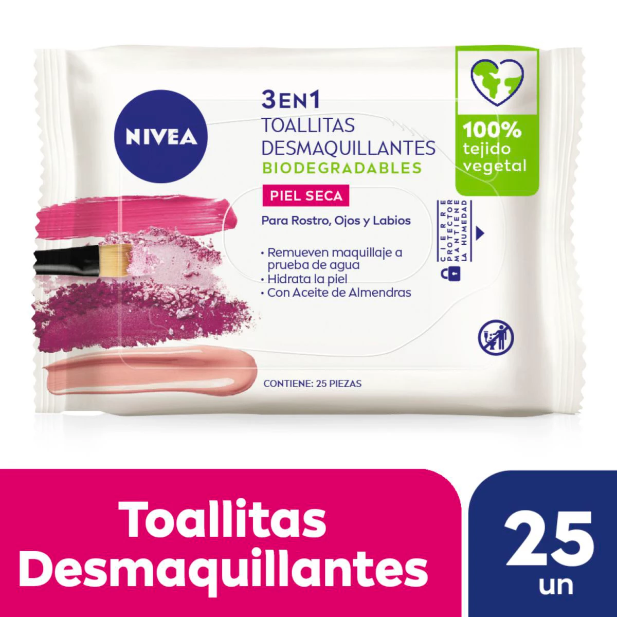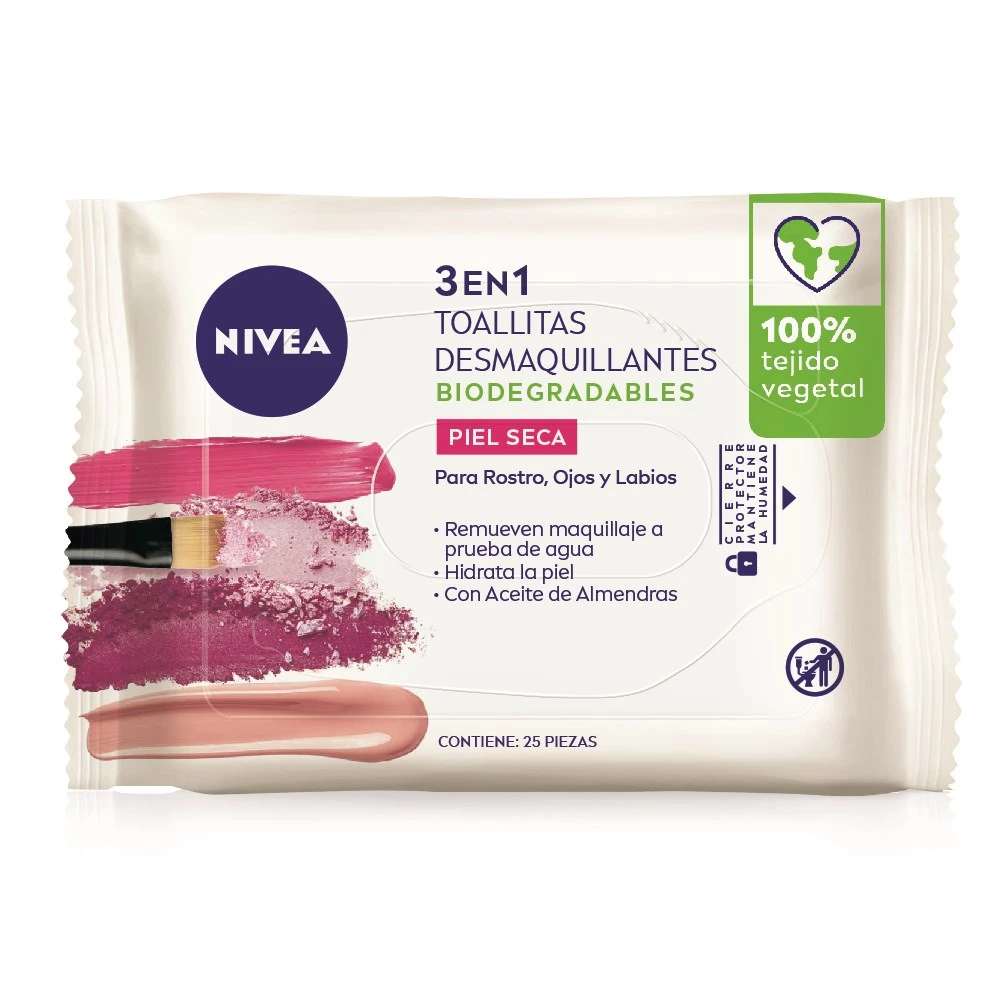 Las Toallitas limpiadoras 3 en 1 NIVEA están especialmente diseñadas para limpiar eficazmente la piel sin dañarla. Su fórmula contiene un Complejo SkinGentle con Pro-Vitamina B5 e Hidramina, ingredientes que remueven eficazmente el maquillaje, incluso la máscara de pestañas resistente al agua y todos los restos de impurezas. Las toallitas desmaquillantes son 100% vegetales y adecuadas para pieles sensibles. Para una experiencia sencilla, eficaz y delicada que deja tu piel suave y nutrida: NIVEA 3 en 1 Toallitas Limpiadoras.