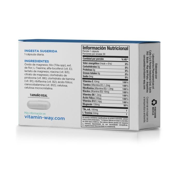 Magnesio Stress Vitamin Way® contribuye a mantener el equilibrio mental y a conservar la calma durante los momentos de mayor exigencia. Ingestas adecuadas de magnesio ayudan a reducir la fatiga, la irritabilidad y la ansiedad leve, ocasionadas por stress. La novedosa fórmula de Magnesio Stress Vitamin Way® refuerza los beneficios del magnesio junto a la L-Teanina que ayuda a conservar la serenidad y mejorar el humor y extracto de Tilo, para favorecer el sueño reparador.
