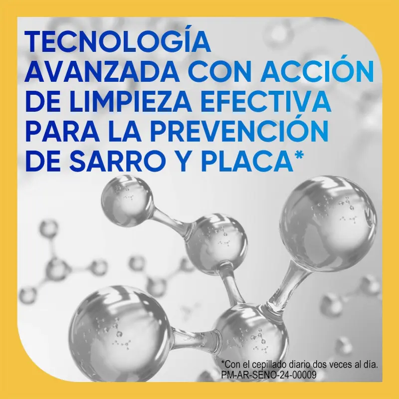 Aqua, Sorbitol, Hydrated Silica, Glycerin, Pentasodium Triphosphate, Potassium Nitrate, PEG-6, Sodium Lauryl Sulfate, Aroma, Xanthan Gum, Cocamidopropyl Betaine, Titanium Dioxide, Silica, Sodium Hydroxide, Sodium Saccharin, Sodium Fluoride (contiene 1426 ppm de ión flúor), Limonene. Contiene Fluoruro de Sodio.